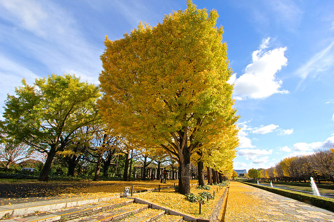 Within the sprawling public park, I first made my way to one of the most impressive leaf-watching spots here, the Icho Namiki (or "Avenue of Ginkgo Trees"). The color here was absolutely gorgeous as the aisles of ginkgo trees around the central reflecting pool were just in the midst passing their peak color today. This weekend would be a perfect chance to catch the color here while it's still mostly on the trees as the leaves are already falling and will be mostly gone in a week or two.