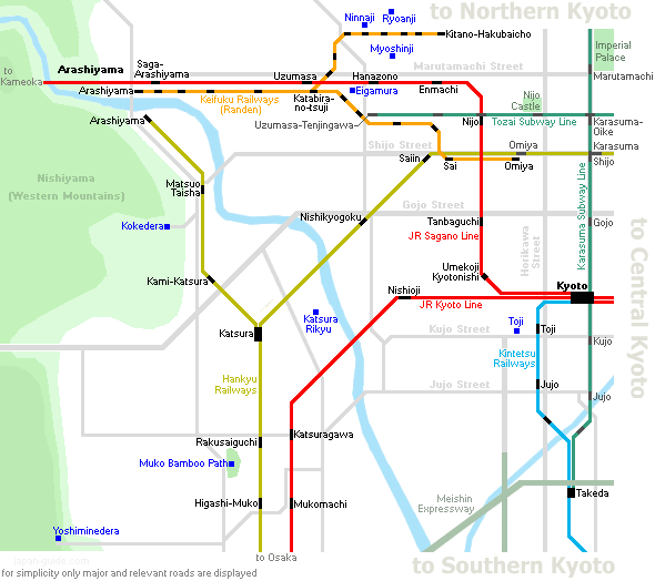 The small trains on the Keifuku Arashiyama Line connect Arashiyama with Omiya Station at the intersection of Shijo Street and Omiya Street in central Kyoto (20 minutes, 250 yen). Keifuku Railway also provides access to Kitanohakubaicho Station in northern Kyoto, not far from Kinkakuji, Ryoanji and Ninnaji temples (20-30 minutes, 250 yen). One transfer of trains is required along the way. Keifuku Arashiyama Station is located in the very center of Arashiyama.