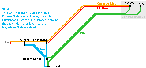 Kuwana Station and Nagashima Spaland are connected by 3-4 buses per hour (600 yen, 20 minutes). A different bus connects the station with Nabana no Sato (300 yen, 10 minutes, hourly). During the winter illuminations from mid/late October to around the end of May (October 18, 2025 to May 31, 2026), the bus to Nabana no Sato departs from Nagashima Station instead of Kuwana Station (230 yen, 10 minutes, every 20-60 minutes).