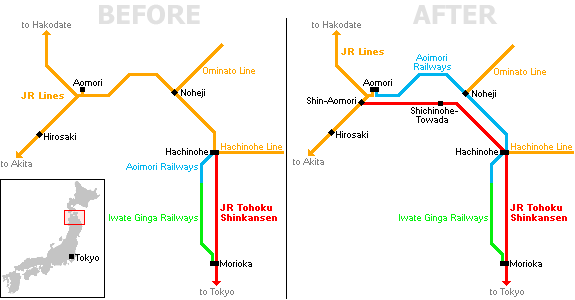 With the completion of the Tohoku Shinkansen, JR East transferred the non-shinkansen railway tracks between Hachinohe and Aomori to Aoimori Railways, a non-JR company. This results in the unique situation where the JR Ominato Line (from Noheji to the Shimokita Peninsula) is now completely isolated from the rest of the JR network and the JR Hachinohe Line remains connected to the JR network only through a shinkansen line.