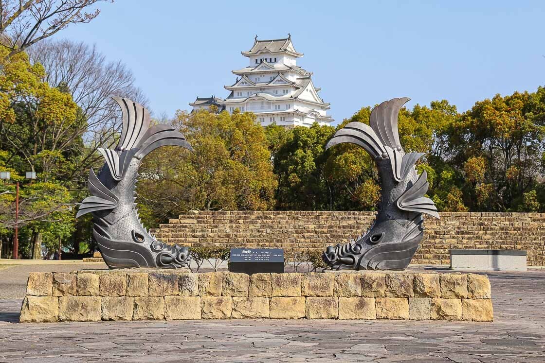 Shiromidai Park is immediately southwest of Himeji Castle, and its main attraction is a pair of 1.9 meter tall shachihoko, mythical carps with the head of a lion and the body of a fish. The shachihoko are a full scale replica of the ones on the roof of Himeji Castle. Visitors can take commemorative pictures between the shachihoko with the castle in the background.