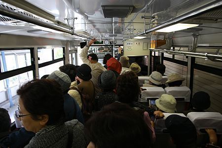 As expected, the trees around Kurobe Dam (at a modest altitude of 1450 meters above sea) have not turned colors yet, and are likely to take at least two more weeks to reach their best state. We got some pictures of the impressive dam and rushed to get ahead of the tour groups for the next stage of travel, the Kurobe Cablecar.