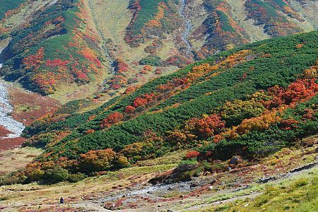 With heights of over 3000 meters, the peaks of the Tateyama mountain range in Toyama Prefecture are among the tallest in the Japan Alps. Consequently, their slopes are among the first places on Japan's main island of Honshu to see autumn colors.