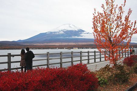 Mount Fuji towering over Lake Kawaguchi (Kawaguchiko), framed by red maple leaves and blue sky... This is the photo I hoped to capture during this 2-day koyo trip to Fujigoko (Fuji Five Lakes).