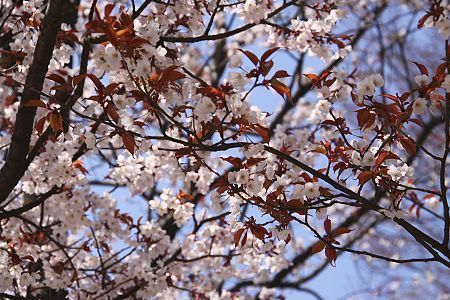 The majority of cherry trees on Yoshinoyama are Yamazakura rather than the elsewhere predominant Somei Yoshino. Yamazakura are the native, wild cherry tress of Japan. They have fewer and slightly smaller blossoms than the cultivated Somei Yoshino, and they develop their copper colored leaves at the same time as their blossoms, giving the trees a less intense appearance.