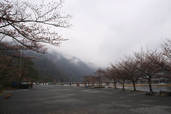 Most cherry trees in Arashiyama, a popular district on the outskirts of northwestern Kyoto, have only just started to open their blossoms and are still below the ten percent mark. The trees in the Nakanoshima Park along the river are particularly little advanced, probably due to the fact that there is no shelter that protects them from the forces of the weather.