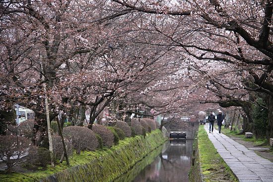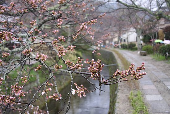 Cherry trees along the Philosopher's Path have only just started to open, and the cold and rainy weather of today and the coming few days provides no reason for them to open up quickly. It is unlikely that the trees along the two kilometer long walking path will reach full bloom before later next week.