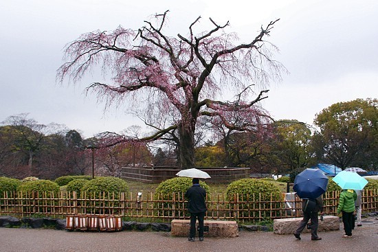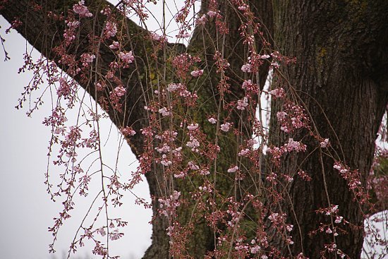 Only a small number of trees, that are of different varieties than the dominant somei yoshino, have progressed further, including a few weeping cherry trees (shidarezakura). In general, the blossoms are unlikely to progress considerably over the coming two days due to cool and rainy weather, and the weekend will still be too early for full bloom.