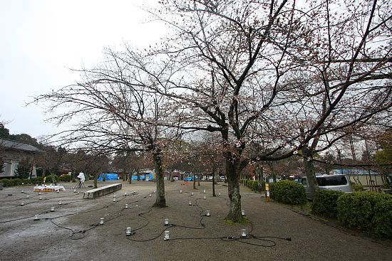 The bad weather did not attract a lot of cherry blossom viewers today, and it seemed that tourists were outnumbered by workers who started to prepare the park for the upcoming cherry blossom festivities and cleaned up lights and installations from the Hanatoro event, which had ended yesterday.
