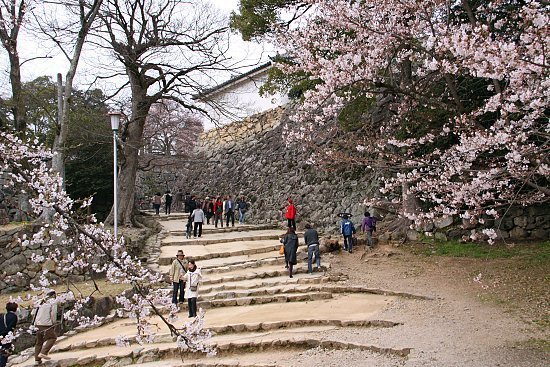 Hundreds of cherry trees are planted around the grounds and along the moats of Hikone Castle, creating impressive sights and providing a few nice spots for hanami picnics. Among the nicest spots are the tree lined moats and the park areas in the Kanenomaru citadel along the approach to the castle keep and the Nishinomaru citadel directly behind the keep.
