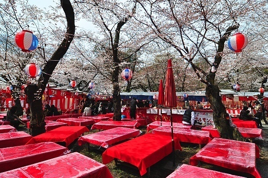 The trees around Hirano Shrine appear to have just reached full bloom. Part of the grounds are set up as a strolling area with walking paths through the trees, while the rest is devoted to food stalls with benches and platforms where you can sit and enjoy the blossoms while having all kinds of festival food.