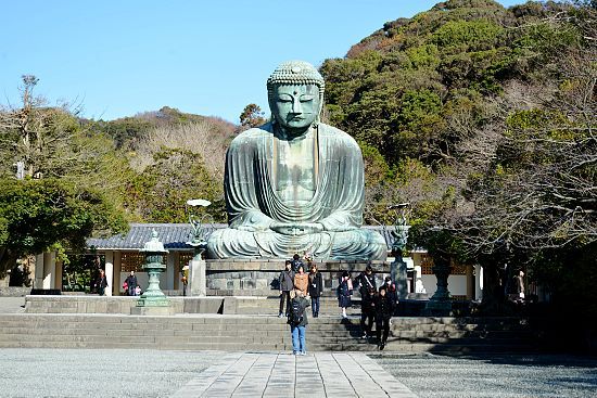 A short walk away is the Great Buddha (Daibutsu), a large bronze statue of Buddha that is probably one of the most iconic images of Kamakura. There are not many trees planted around the statue, but the maples that were there looked to be approaching their peak.