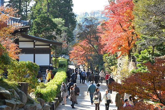 My first stop this morning was to Hasedera, a Jodo Sect Buddhist temple that houses a nine meter high statue of Kannon, the goddess of mercy. Hasedera has several maple trees planted along its staircases and around its main lower pond. Most of the trees were still approaching the peak today, and were particularly nice along the staircases. However, as we have seen in previous years, the foliage around the lower pond was looked dry and burned.