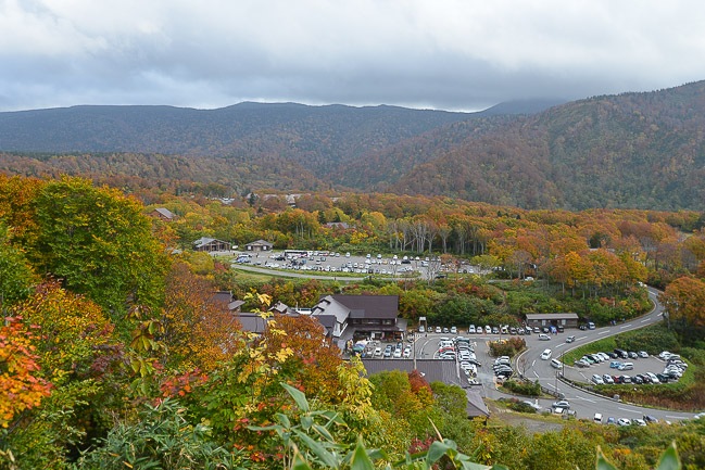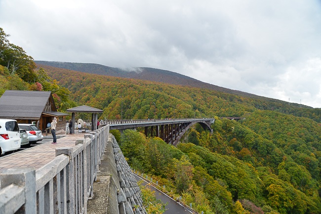 From Kenashitai it was less than an hour to Sukayu Onsen, most of which was under the forest canopy. The colors continued to improve as we descended the mountain, however they were difficult to see without any breaks in the forest from which to look out. We finally caught a nice view once the trail left the cover of the trees just above Sukayu Onsen. The colors around the hot spring still look to be developing and should continue to improve with time. We also made a quick stop at Jogakura Bridge, another popular koyo spot between Sukayu Onsen and the lower station of the Hakkoda Ropeway. The colors around the bridge were also in the early stages and looked to be a bit behind the trees around Sukayu Onsen.