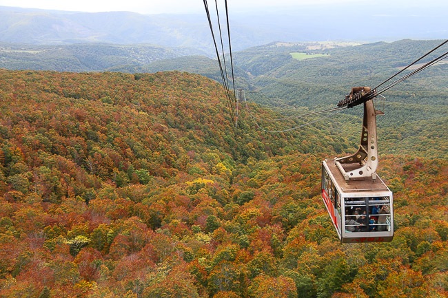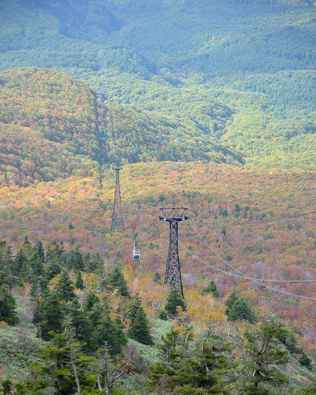 Today's plan involved taking the Hakkoda Ropeway to the top of Mount Tamoyachidake, one of almost a dozen peaks that make up Mount Hakkodasan, and walking down the mountain to Sukayu Onsen, a popular hot spring known for its large, mixed gender bath. Being the start of a three day weekend, there were busloads of other leaf chasers in line for the ropeway when we arrived. We ended up having to wait about 30 minutes to board, but the wait was worth it as the views of the slopes below the ropeway were beautiful.