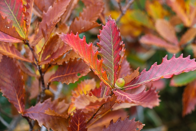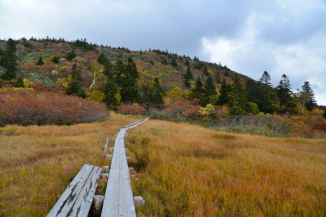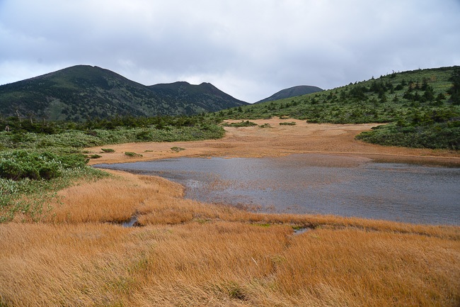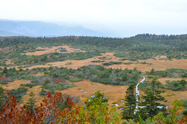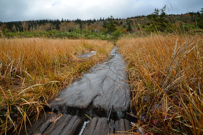The trail branches off at the far end of the hiking circuits, leading down the mountain to Kenashitai, one of the popular koyo spots on Mount Hakkodasan, which exhibits a variety of colorful mountain shrubs such as Japanese Rowan (nanakamado) and oak (nara). Kenashitai is made up of two expanses of marshes connected by a steep set of stairs between them. While there were few colors left to see around the upper marsh, the bushes along the stairs were still pretty good today. Unfortunately, many of the shrubs around the picturesque lower marsh have already begun to drop their leaves and most of the color that was left was provided by the marsh grasses.
