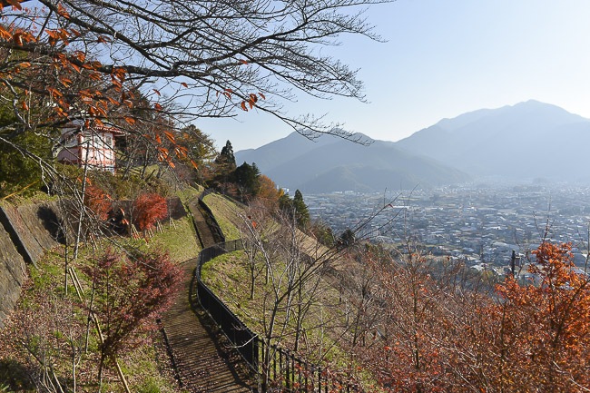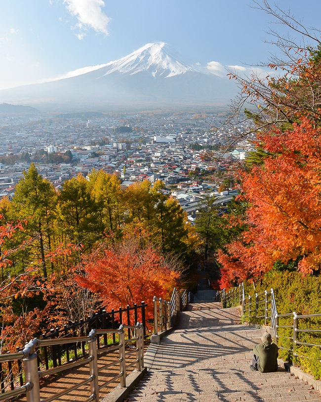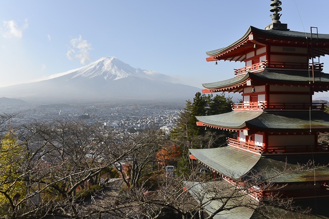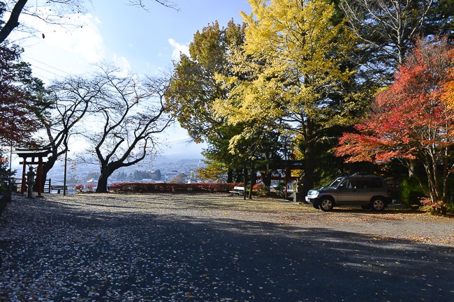 The first stop of the day was at the Chureito Pagoda. Last time I said that the cherry trees around the base of the pagoda were already pretty brown and that the maples seemed to be around the peak, so today it wasn't much of a surprise to find the cherry trees almost completely barren and the overall state along the slope to be a little past the peak and starting to decline. A few of the maples along the stairs still looked nice, but were really beginning to lose their leaves. In addition, the Larch trees are starting to change to their characteristic yellow, which is another indicator that the season will soon be coming to an end. Nevertheless, there were still enough leaves to get some nice shots in combination with the beautiful, clear weather that lasted all day.