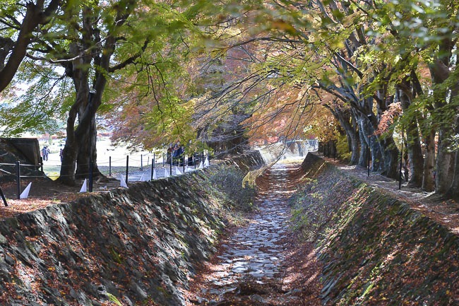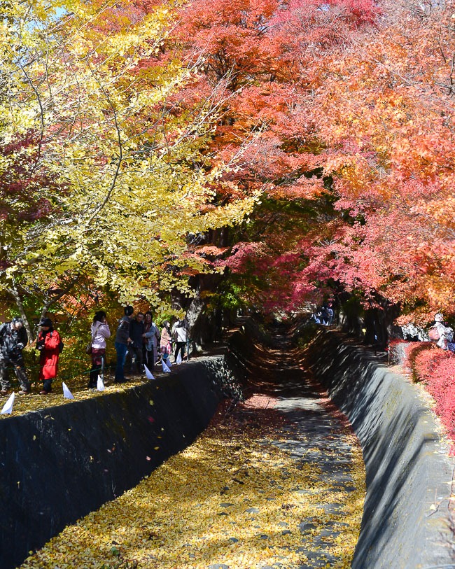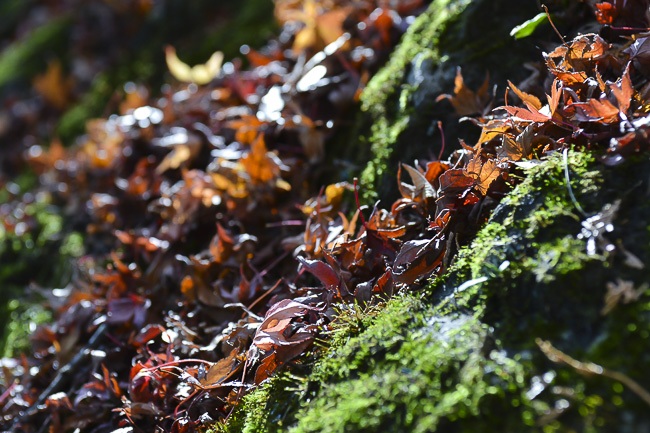 The trees along the nearby Maple Corridor were also very nice this morning. While some of the maples trees remain relatively green, especially those found along the more heavily sheltered bank, most of the trees that were nice last time have zoomed past their peak and have already lost a fair number of leaves. Today the best colors were found around the entrance to the corridor and around the Kubota Itchiku Kimono Museum just up the hill.