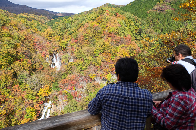 Our last stop today was at the Kirifurinotaki Falls, an impressive two tiered waterfall north of the town center. The name Kirifuri means "falling mist", as the water practically turns to mist as it travels down the 75 meter drop to the waterfall basin. Kirifurinotaki can be accessed by hourly buses from central Nikko. You used to be able to hike down to the base of the falls from the parking lot, however the trail was closed after sections of it collapsed. Instead, there is a wooden observation deck which can be reached in about five minutes along a short hiking trail. The colors that surround the falls are usually best from late October to early November. Today they looked to be right around the peak, but with the potential to improve further over the coming week or so.