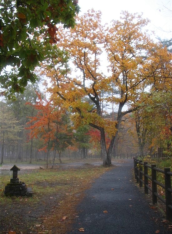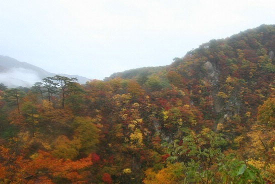 It was a wet day. I made my way to Naruko Gorge in the morning expecting the best and worst day for autumn color reporting: best because I read that colors are currently at their peak there, worst because, well, it was a wet day.