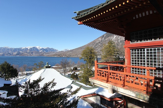 I noticed not many visitors as we made our way towards Lake Chuzenji; a stark contrast to how it would typically be during the autumn color season. We stopped at Chuzenji Temple, which stands on the eastern bank of the lake. The temple is somewhat notorious for monks using pressure tactics to sell amulets to visitors, but nonetheless I thought that the visit was worthwhile for its beautiful and unique statue of Kannon (the Buddhist Goddess of Mercy), carved out of a tree trunk that still stands today with its roots in the ground.