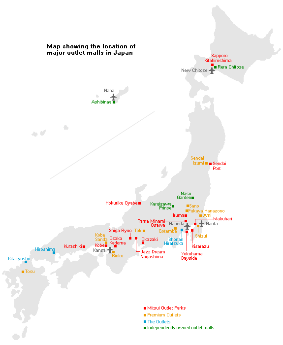 There are more than 30 outlet malls nationwide from Hokkaido in the north to Okinawa in the south, although most are found in the Kanto and Kansai regions where they are usually built outside of the city centers near major airports and expressways. Aside from a few independent ones, most outlet malls in Japan are managed by three companies: Mitsui Outlet Park, Premium Outlets and The Outlets by Aeon Mall. In general, though, most outlets malls tend to have similar brand stores. Below are some of Japan's most popular outlet malls: