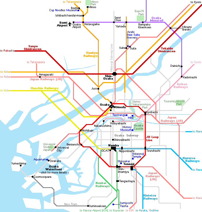 The city's two largest shopping districts are Umeda in the north and Namba in the south. The Umeda area (also known as Kita) is served by JR Osaka Station and Umeda Station, while the Namba area (also known as Minami) is served by Namba Station. Both areas have large concentrations of department stores, shopping arcades and some of Japan's most extensive underground shopping malls.