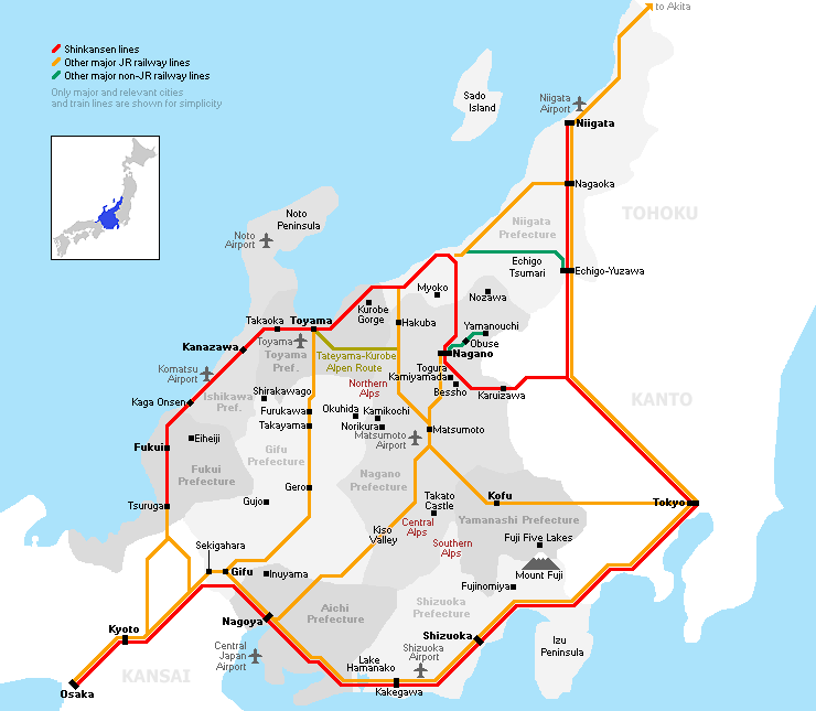 The prefectures along the Sea of Japan (Fukui, Ishikawa, Toyama) are also known as the Hokuriku Region, while the southern part (Shizuoka, Aichi, Gifu) is also known as the Tokai Region. Yamanashi, Nagano and Niigata make up the Koshinetsu Region.