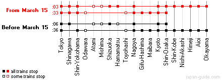 Other changes involve the stopping pattern of trains along the Tokaido Shinkansen. Namely, all trains will be stopping at both Shinagawa and Shin-Yokohama Stations from March 15, including all hikari and nozomi trains. So far, many trains have been skipping one of the two stations. Furthermore, the stopping pattern of the two hourly hikari trains between Tokyo and Okayama will be changed as illustrated below:
