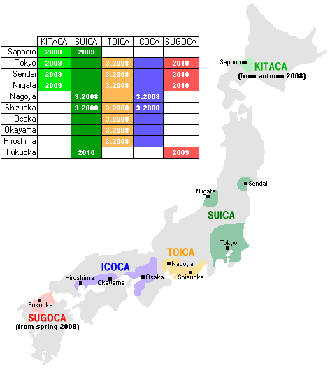 From March 29, Toica will become compatible with JR East's Suica Card (Greater Tokyo, Sendai and Niigata) and JR West's Icoca Card (Greater Osaka, Okayama and Hiroshima). As a result, it will become possible to use JR trains in the Greater Tokyo, Nagoya and Osaka areas with just one prepaid card. From autumn 2008, JR Hokkaido will introduce Kitaca, a IC prepaid card for the Greater Sapporo area. Kitaca is scheduled to become compatible with Suica in spring 2009. Also in spring 2009, JR Kyushu plans to introduce Sugoca, a IC prepaid card for the Greater Fukuoka area. It is scheduled to become compatible with Suica in spring 2010.