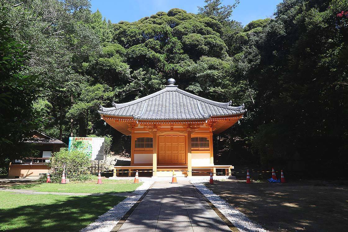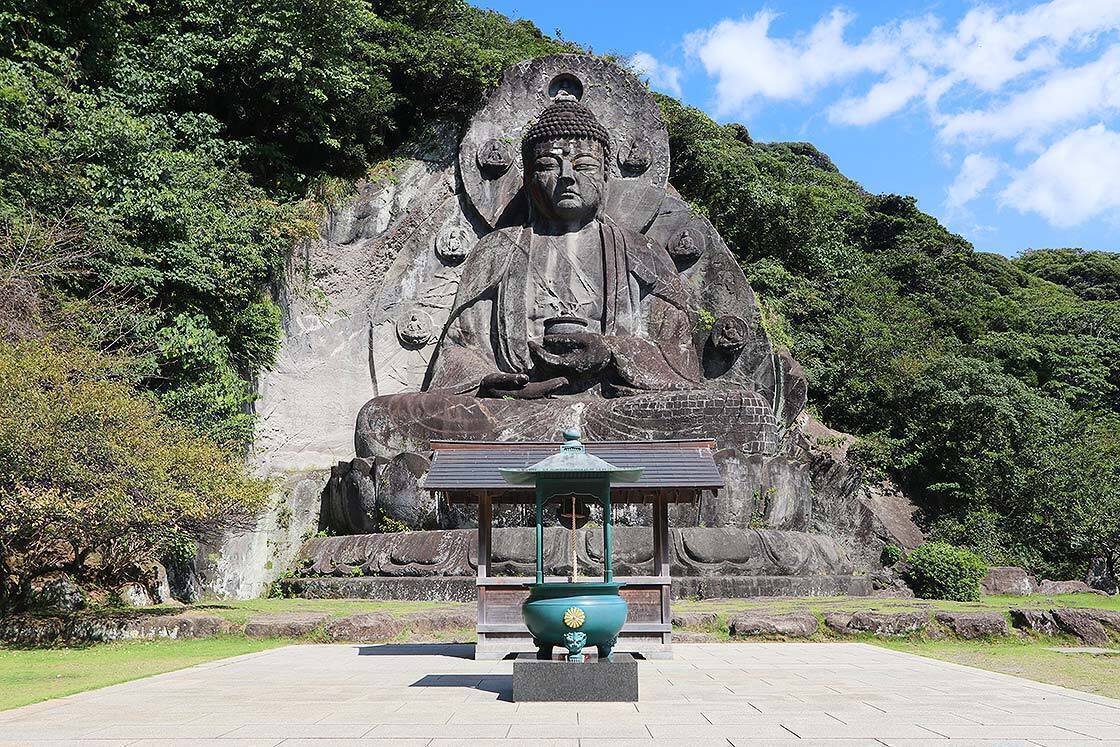 Traditionally, the temple is said to date to 717 when a priest named Gyoki carved an image of Kannon in her eleven-headed aspect into the cliff wall. Many years later, a hall was built around the sculpture with a stage-like balcony overlooking the Tateyama Bay. Over the centuries, a combination of harsh sea air, earthquakes and general deterioration took a heavy toll, requiring near-constant repair. The current structure dates to about 1925, and visitors may still be able to catch a glimpse of the original carving through a heavy grate that guards the altar.