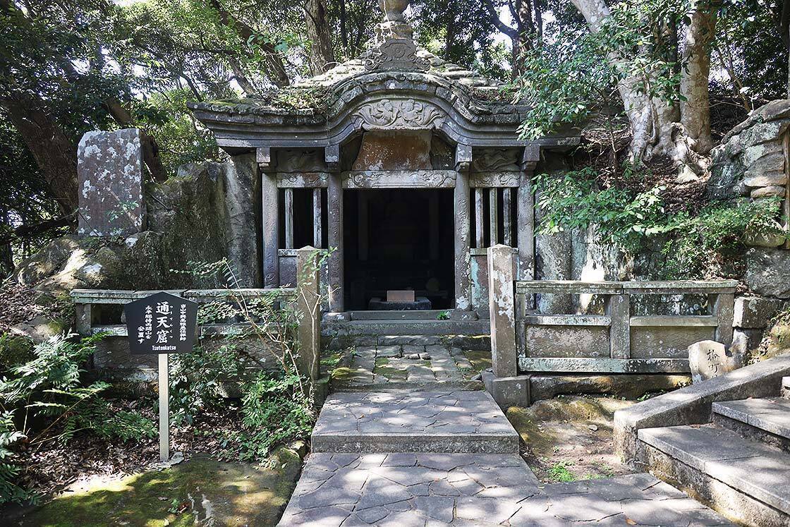 A little way uphill from the main building, we came to a fascinating structure hewn directly into a rock wall, the first of many clues to the mountain's importance as a quarry. Known as the Tsutenkutsu, or Cave of Passing to Heaven, it was made to resemble a small temple complete with pillars and an elegantly gabled roof, and enshrines the Edo Period Zen master Kogaguden.