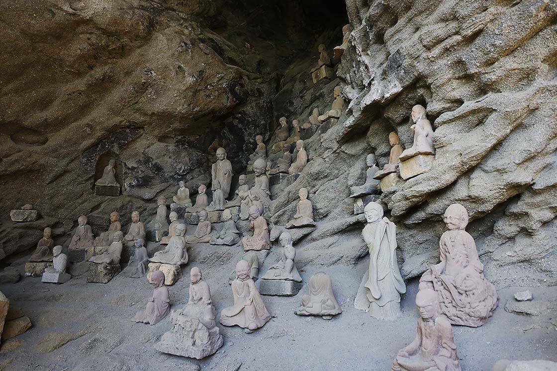 Breathing a little harder as the path began to turn more steeply upward, we started to notice clusters of little statues tucked away in carved grottoes, each one of what appeared to be a monk or mendicant priest rendered in a huge variety of poses and expressions. These are called rakan - traditional depictions of those who have reached a personal level of enlightenment - and, counting all of Nihonji's 1,553 original examples together, the largest collection of them in all of Japan.