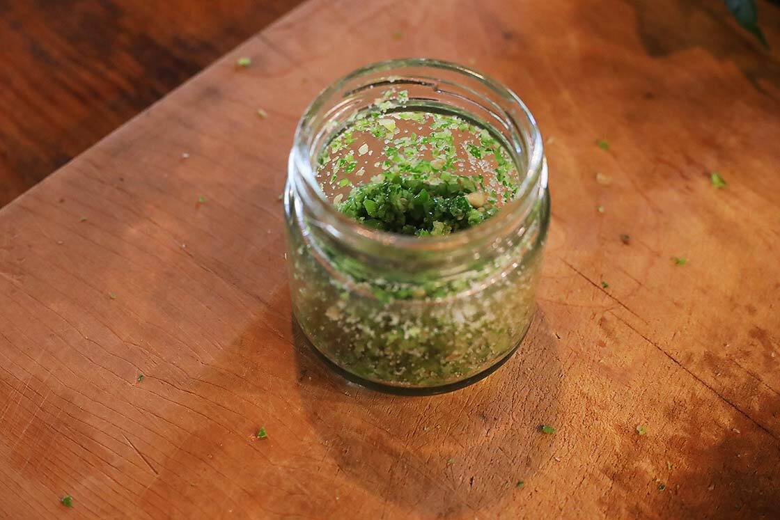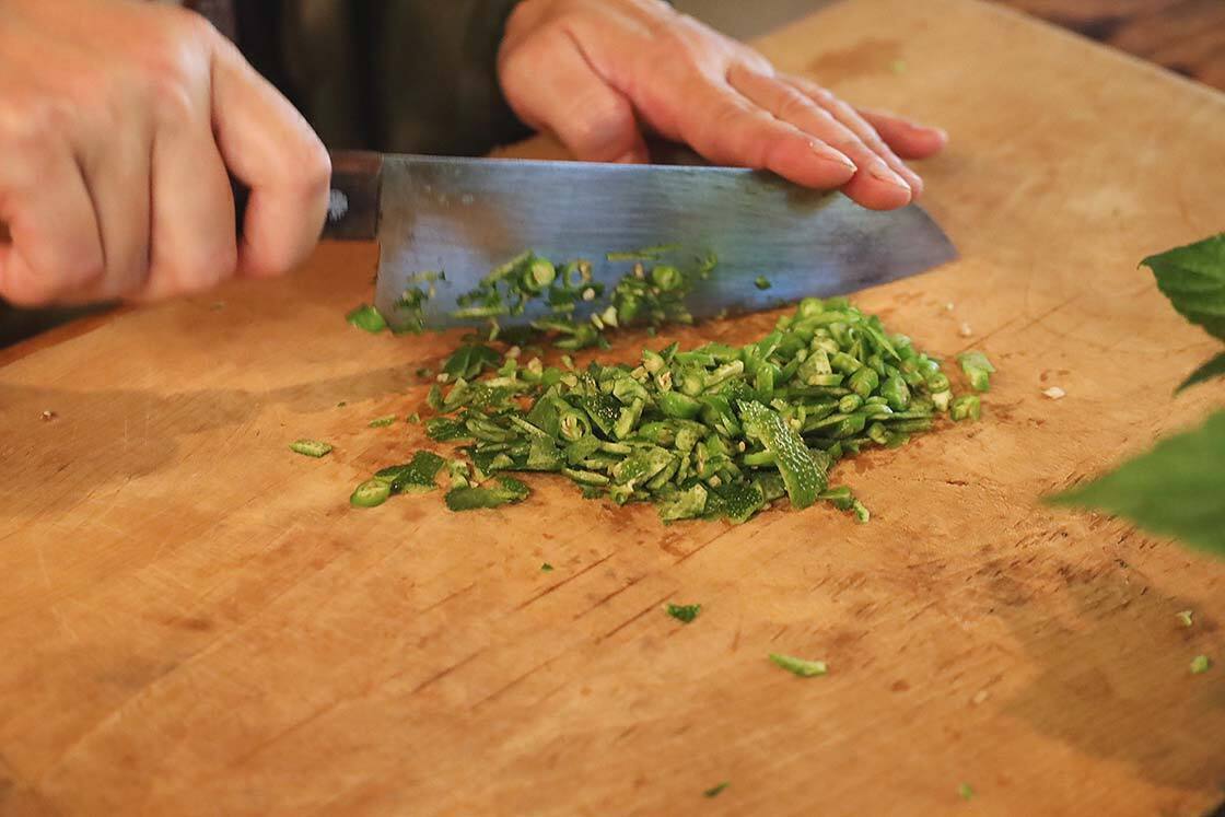 With the ingredients already prepared, the steps to making it were both simple and enormously satisfying - thinly slicing handfuls of the peppers and yuzu peel into a tangy-smelling paste and slipping it into a jar with a drizzle of salt mixed in. This would disappear into a fridge to ferment for up to a year, helping to soften the fire and acidity, while adding additional richness and complexity - perfect for winter dishes.