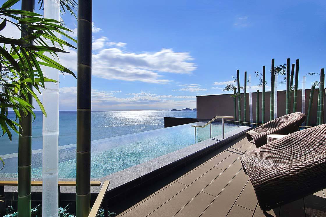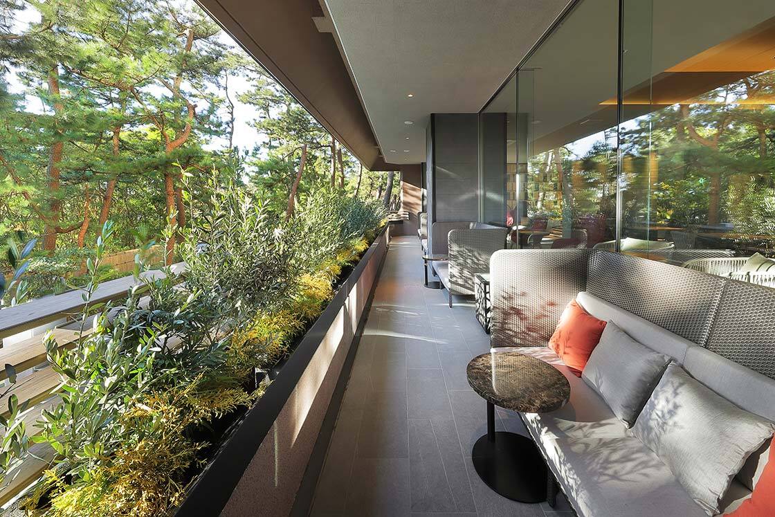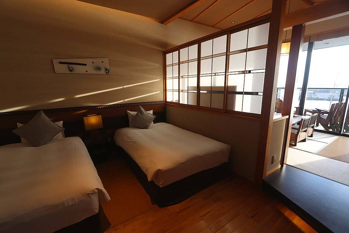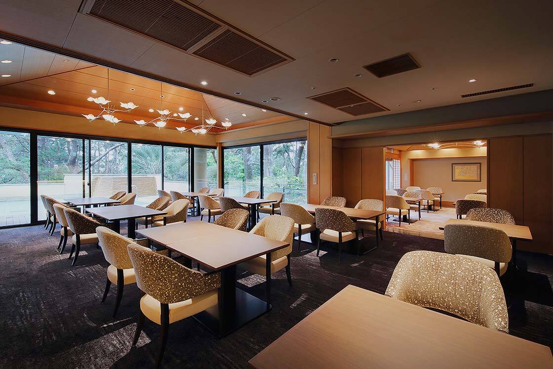 Guestrooms come in a wide range of styles, from classic Japanese-style with tatami and low furniture to elegant hybrid types pairing traditional design with western-style beds. Upgradeable options include extended windows for uninterrupted views over the pine trees toward Maebara Beach beyond, or access to the hotel's stylish lounge and terrace area, where adult guests can unwind with complimentary soft drinks amid soft light and garden views.
