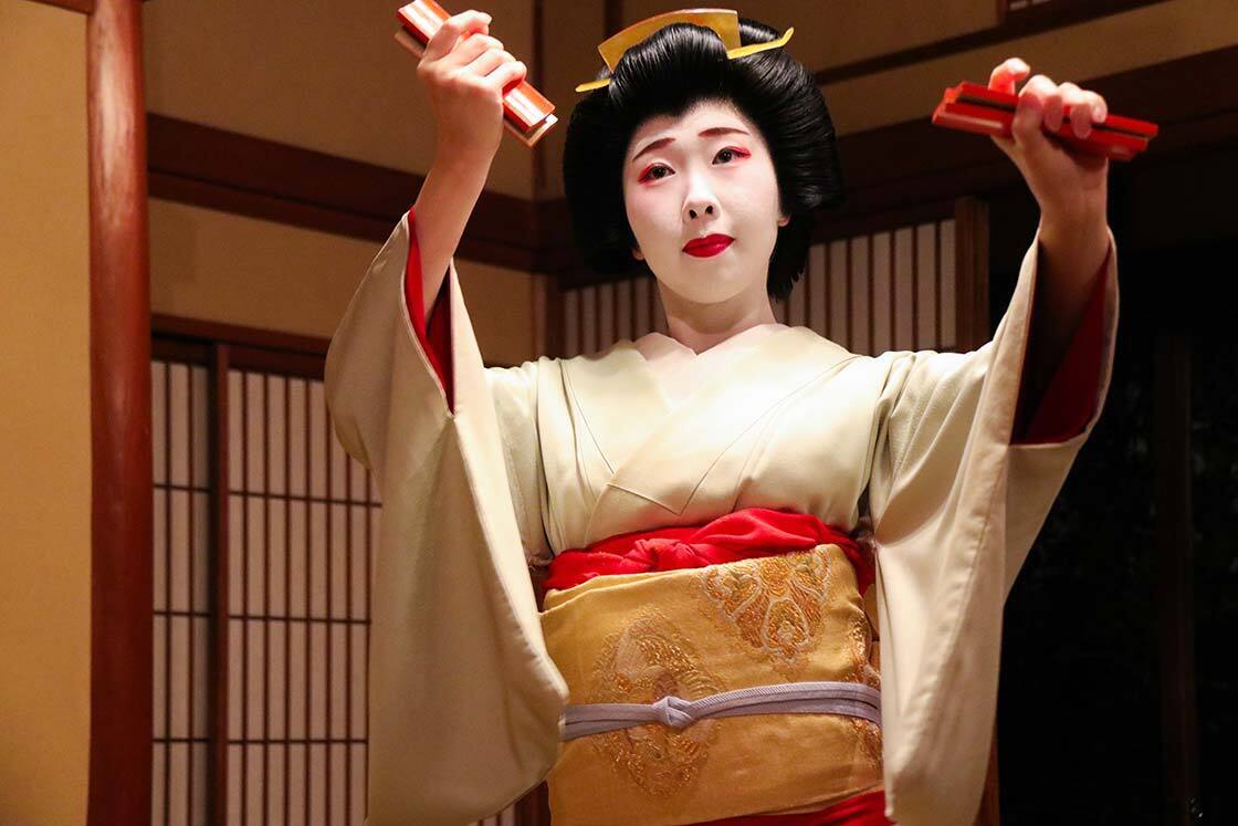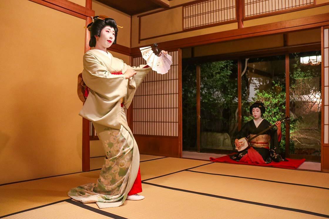 There are typically three parts in a geigi-accompanied dinner. First, some light conversation, then a song and dance performance with musical accompaniment, and finally playing drinking games and photo taking. The number of attending geigi depends on the size of the group. In my case, because of this report, there were two geigi, which is slightly special for a solo diner.