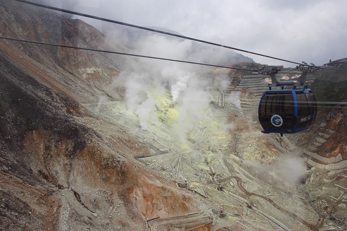 After exiting the art museum I crossed the road to reach Koen-Kami Station along the Hakone Tozan Cable Car. From here, the cable car took me high up the mountain to the Sounzan terminus, where I boarded the Hakone Ropeway towards Owakudani Station. The journey between Sounzan and Owakudani takes around eight minutes and traverses over a steaming sulfur field. Traveling far above the sulfur field made for the perfect vantage point to take in this amazing natural feature.