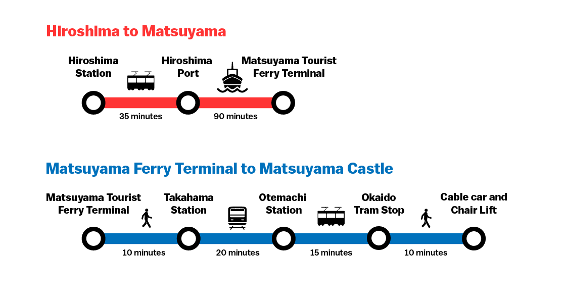 Seeing as there are no trains directly between Onomichi and Matsuyama, I was thankful to start from my base of Hiroshima again. From Hiroshima Station, you can get a tram or taxi to Hiroshima Port, from which Matsuyama takes about 90 minutes on the Superjet ferry. At the other end, it's a 10-minute walk to Takahama Station, followed by about 25 minutes on the train. From there you can walk to the castle, or take the tram to Okaido Station and go up the cable car or chairlift. If that seems like a lot of transport, this could be a good opportunity to stay a night in Matsuyama, too.