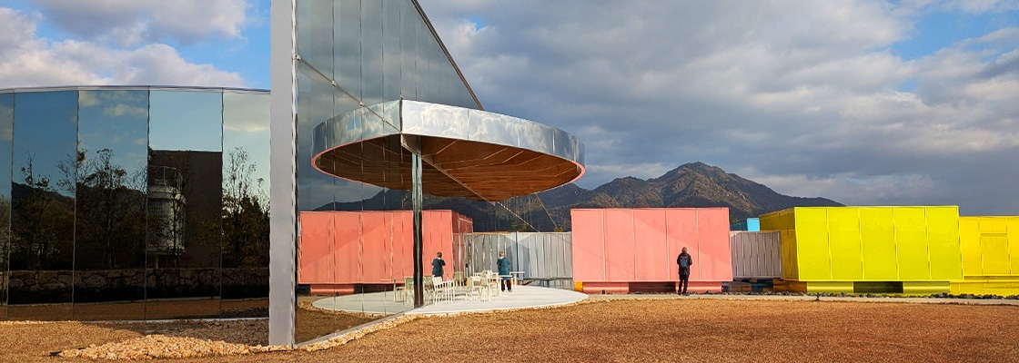 The museum was designed by Ban Shigeru, and is characterized by its rounded entrance and mirror walls towards the back, which reflect the seaside landscape. On the side with the mirror walls is a shallow pool with movable exhibition rooms, inspired by the scattered islands of the Seto Inland Sea that it looks out onto. Inside are temporary exhibitions which are changed throughout the year, both in the galleries and the main building. Outside, there is a garden inspired by the works of Emile Gallé, which has a variety of trees that look their best at different times of the year.