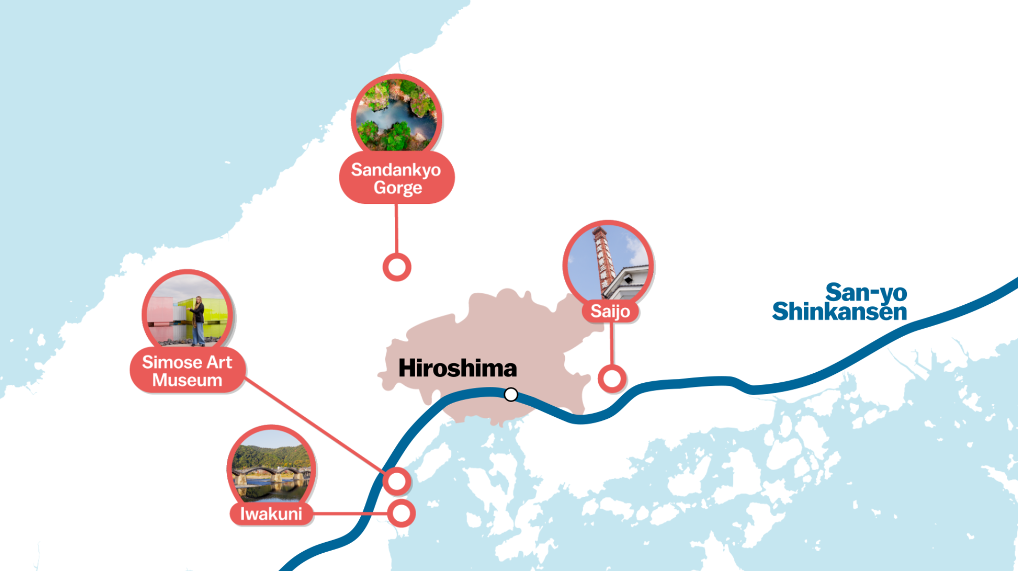 Iwakuni is the trip for anyone interested in history, as you get to see the iconic Kintaikyo Bridge and Iwakuni Castle. Sandankyo is for the outdoorsy adventurers, where you can explore a picturesque gorge and decide how long to make your walk or hike. Simose Art Museum is for the culture vultures, and can be made into a full day or overnight trip thanks to the stylish villas on-site designed by the museum's architect. Finally, Saijo is for the foodies, because this is where you can explore seven sake breweries in one day, or try different food made with sake.