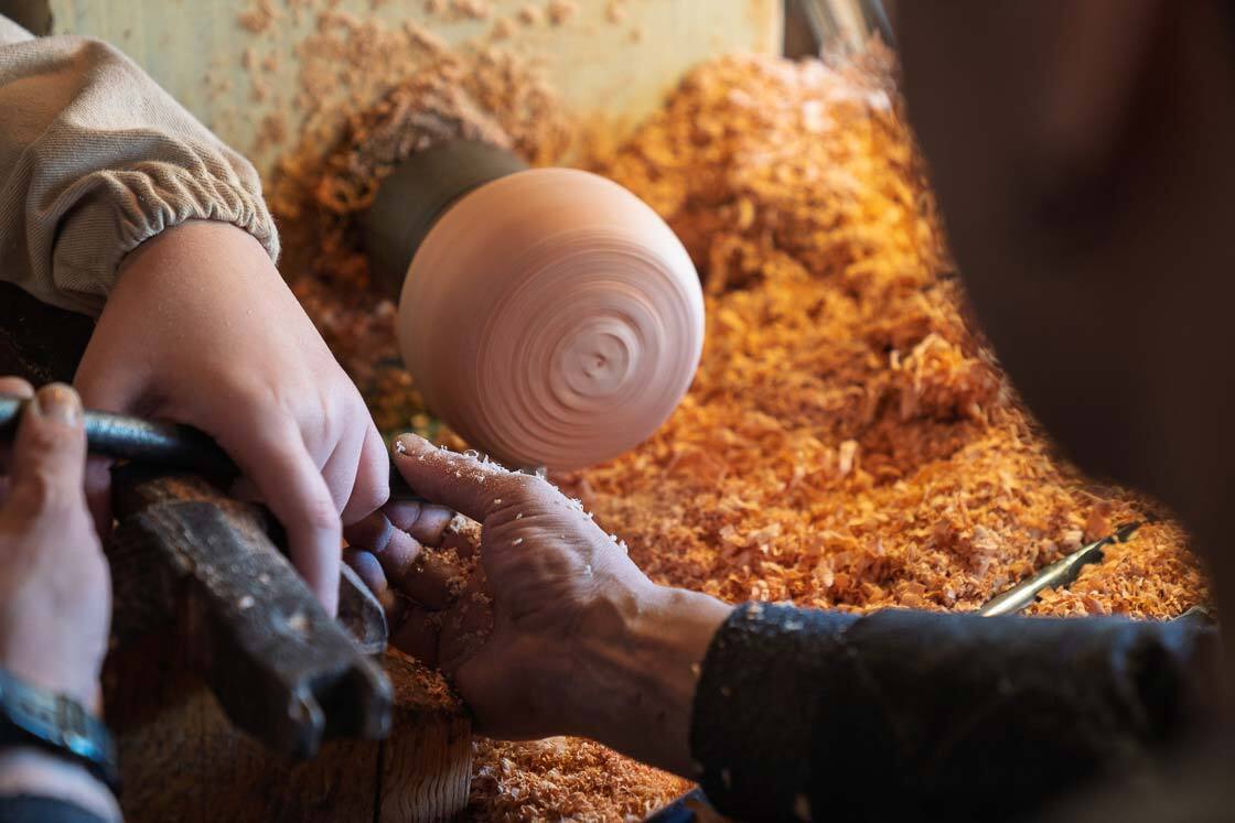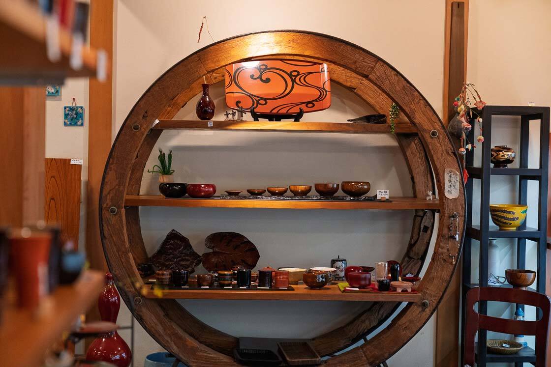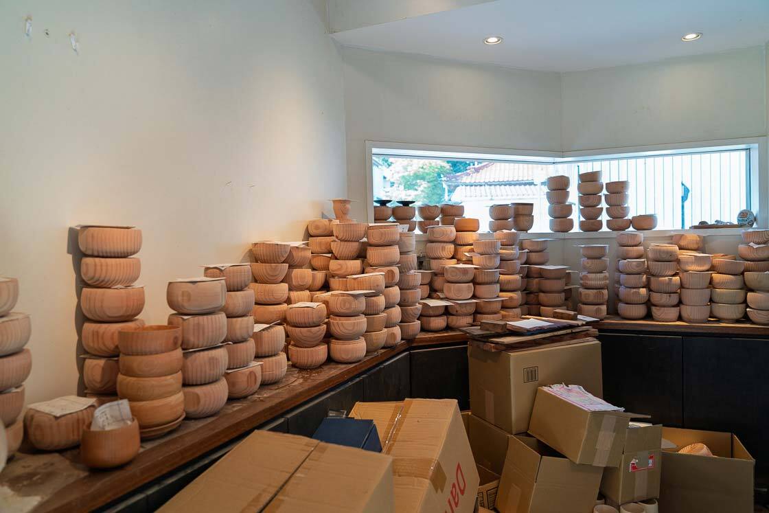 At mokume woodworking studio, visitors can experience traditional Yamanaka woodworking techniques firsthand, creating their own lacquered bowl under the guidance of a master craftsman. The open lathe looks intimidating at first, but once you start working it slowly, shaping the piece of wood into a smooth bowl becomes almost meditative. Multiple tools take the surface from rough to fine as the experience progresses. Craftsman Yuji Sato is hands-on throughout, showing you exactly how to work each tool and helping craft the piece. You'll shape the outside of the bowl, and then Sato will remove the center, lacquer it, and send it to you later. The factory and showroom are compact and intimate, with pieces created by previous students piled along the walls and wood shavings in the corners indicating the space is constantly in use.