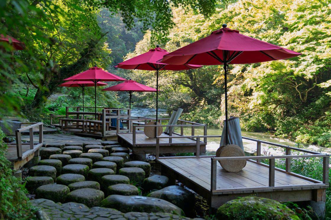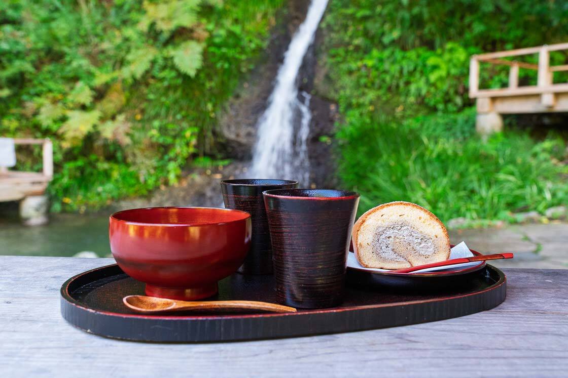 The Kakusenkei Kawadoko riverside cafe sits right at the water's edge on raised platforms, and is open from April to November. To reach it along the cobblestone path, you cross a small stream flowing from a waterfall-fed pool upstream, so you're surrounded by the sound of water from multiple directions. The development of the sweets served here was supervised by Rokusaburo Michiba, one of the famous Iron Chefs, who was born in Yamanaka Onsen.