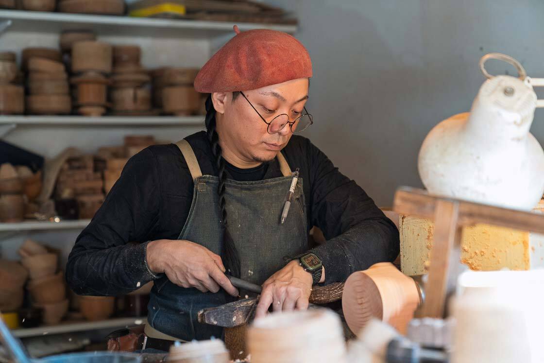 Sato moved here from Osaka after studying design at university. He felt drawn to making physical objects rather than visual work, and came to Yamanaka Onsen specifically because the woodworking practitioners here have the best techniques in the country. The area has over 450 years of woodworking history, and he studied here for five years before deciding to open his workshop, which he has now run for 12 years. Many woodworkers come to study and leave after two to four years to set up their own practices elsewhere, but Sato stayed because there's so much to learn while living in the region.