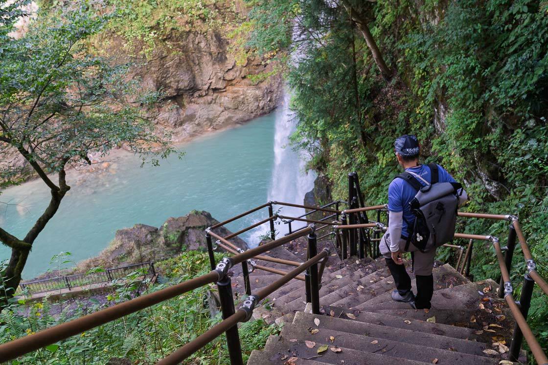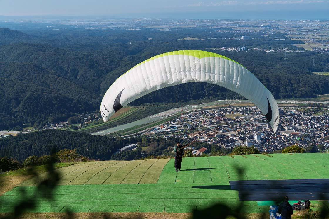 Along the routes, you'll also encounter Tedori Gorge, where the river has cut deep into the rock, giving a raw and natural feel. Wakagataki Waterfall is another feature of the area, with water cascading down the rock face. The falls are accessible from the cycling route, making them a natural place to stop. At Shishiku Plateau, a gondola takes visitors to about 650 meters elevation, where paragliders lift off facing the Tedori alluvial fan. On good days when the wind is appropriate, over a hundred people take off the paragliding ramp, making for a spectacular view whether you're at the top watching them launch or at the bottom seeing them glide around above you. The tours can be customized in consultation with your guide, and spots not included in the standard route can be added upon request, allowing you to tailor the experience to your interests.