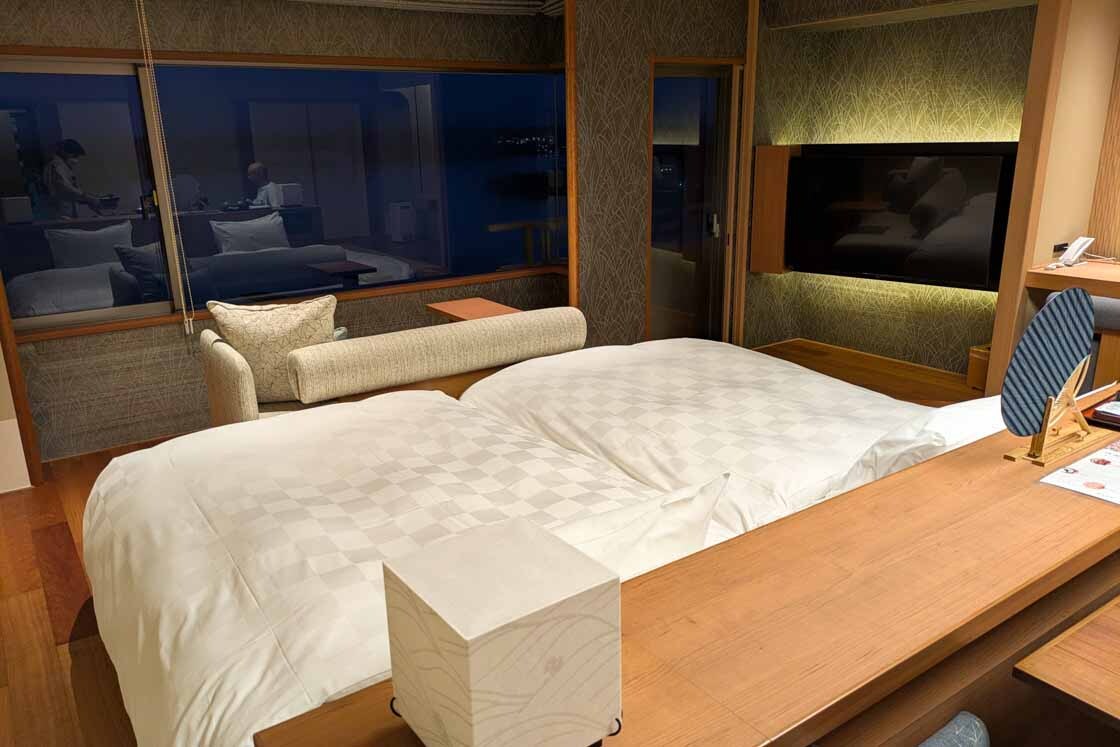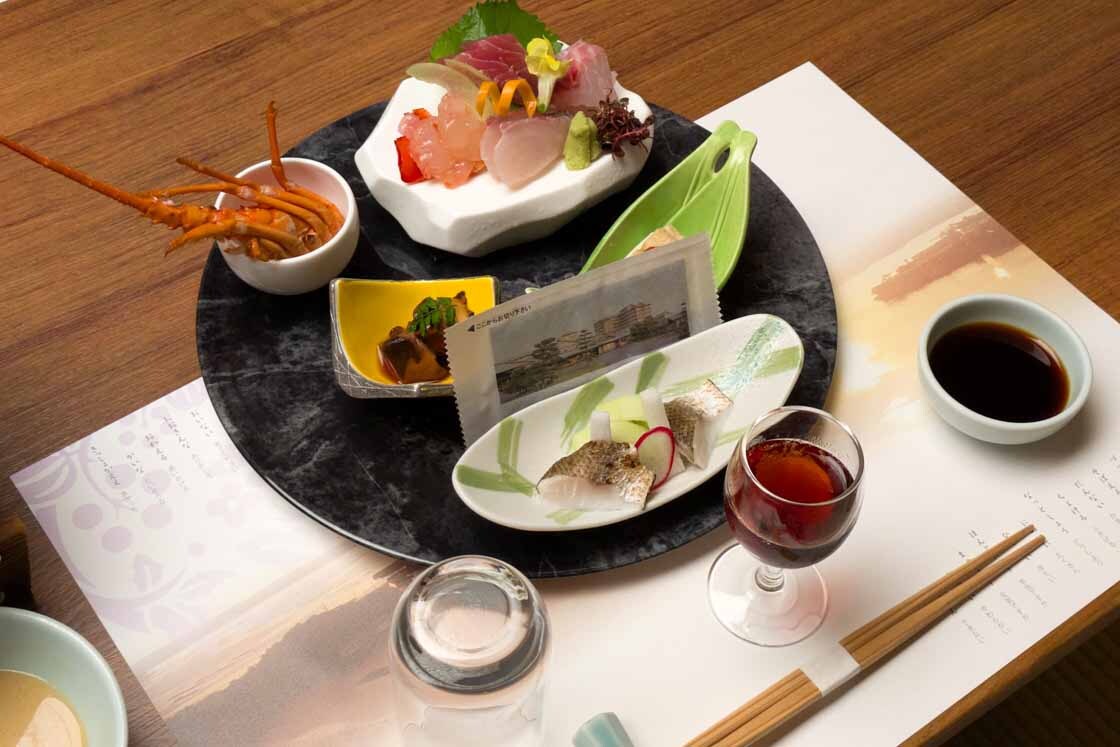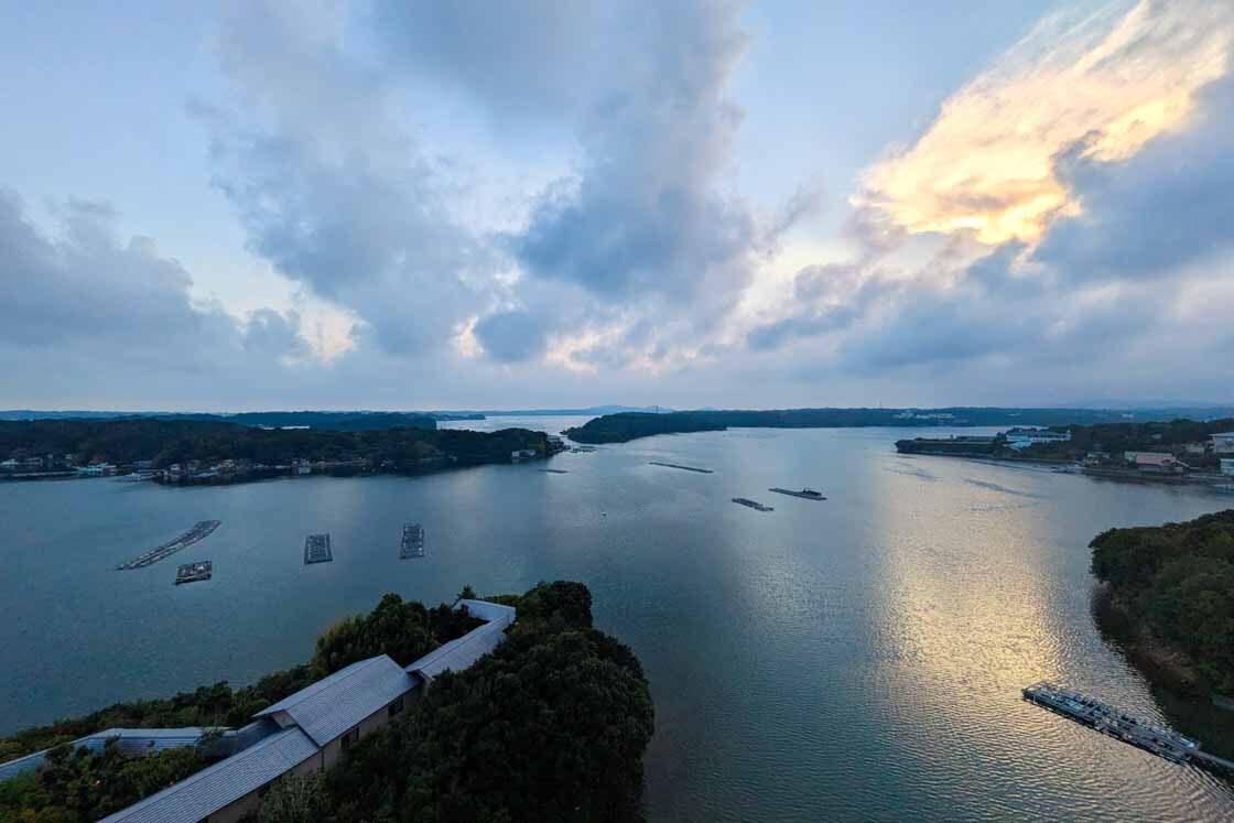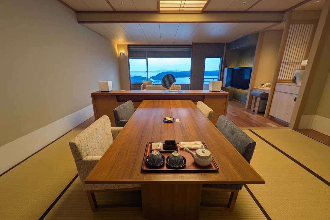 The hotel had an impressively spacious lobby area, with an indoor garden complete with a waterfall. As we were there for a video and article, we were shown two different types of room, but it seems anywhere you stay has a lovely view of Ago Bay. Depending on the type of room, you can have dinner downstairs or in your room. It was a lovely several-course meal rich with seafood from the area.