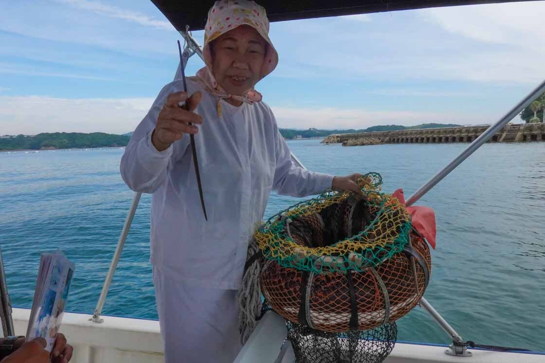 On my tour, I met the staff and ama at Entrada Kashikojima, where I was guided onto a boat. We had a little cruise around the bay before stopping at what the ama deemed a suitable spot for diving. She hopped off the boat with what looked like a life ring with netting attached to her. She dove down into the water for under a minute, and came back up with two handfuls of sea snails to show us! I applauded, she put them into her net, and dove back down. Watching from the boat was a fascinating yet peaceful experience, with the sound of the water and the sea breeze.