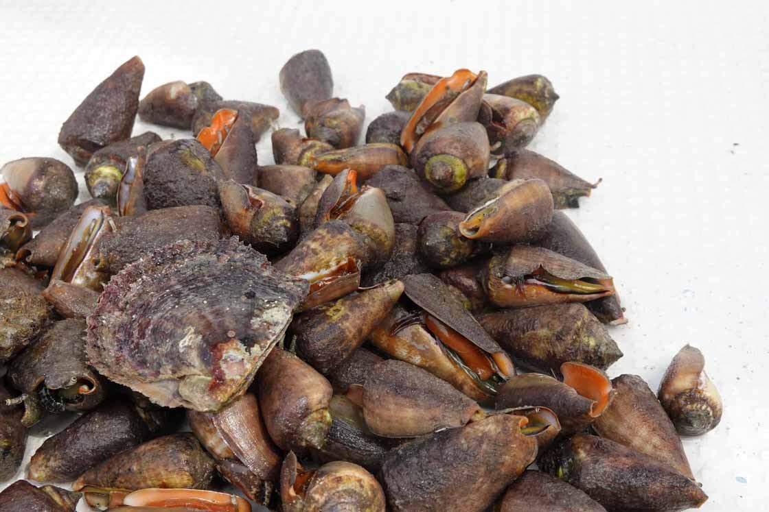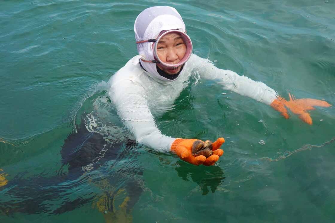 She dove into the water continuously for about an hour, diving down and popping back up with handfuls of shellfish almost every time, her keen eye spotting them straight away. When the hour was up, she came back on board and poured all the shells onto the boat for me to see.