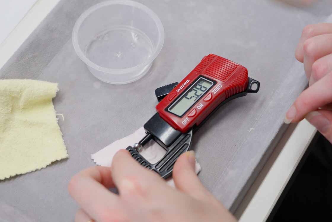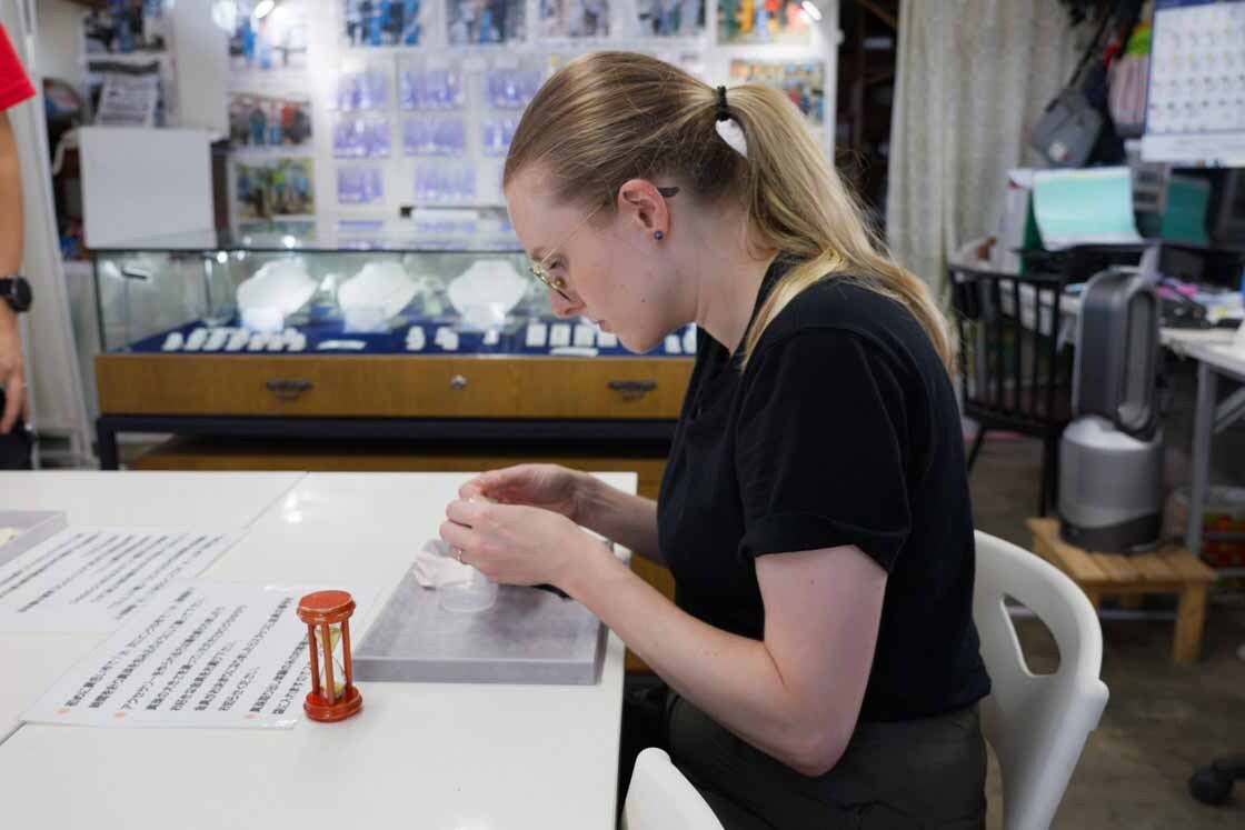 After taking it out of the oyster with a small knife, we then rubbed the pearl in salt, and polished it with two different cloths. The hardest part for me was measuring it with the clamp measure - the pearl is so small and smooth I was scared it was going to fly away!