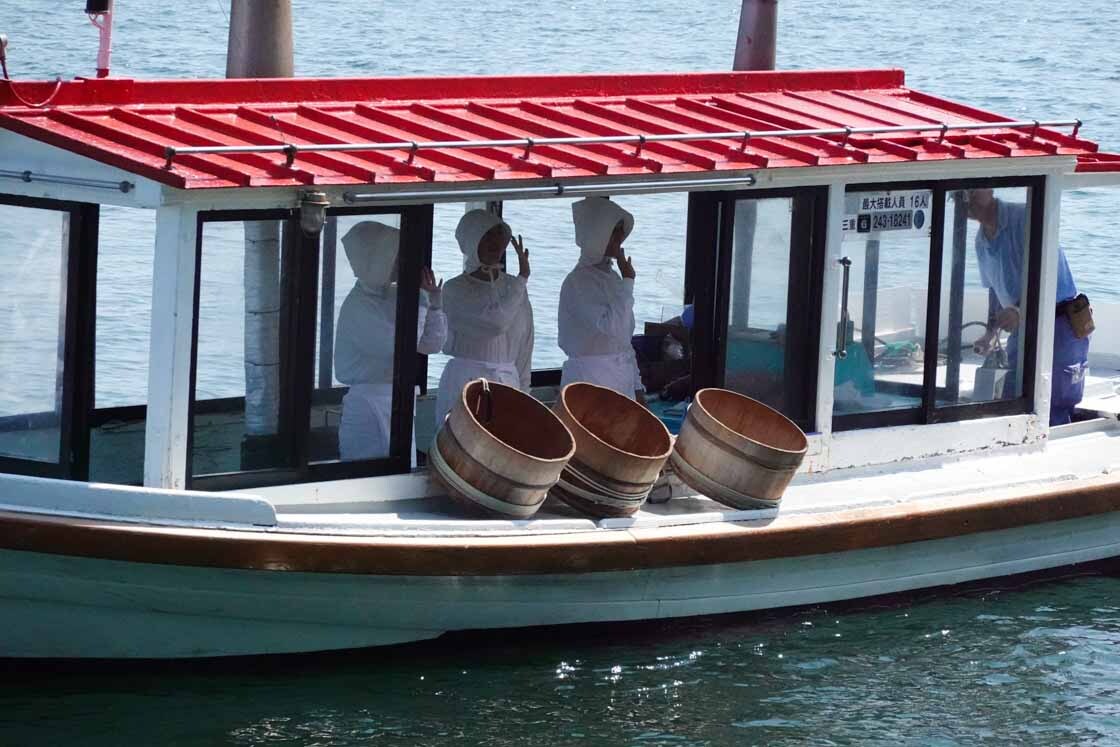 Here you can also see an ama diving performance, so if you're not able to book the boat tour this is an easy alternative. They dive at these times each day, and the performance lasts around 10 minutes. It was fun to see them arrive on their boat and wave to us spectators on the island. They had traditional wooden buckets instead of the rubber ring, and on my visit there were three ama diving at once. Each time they found something they would bring it to the surface and get a round of applause from the audience on land.