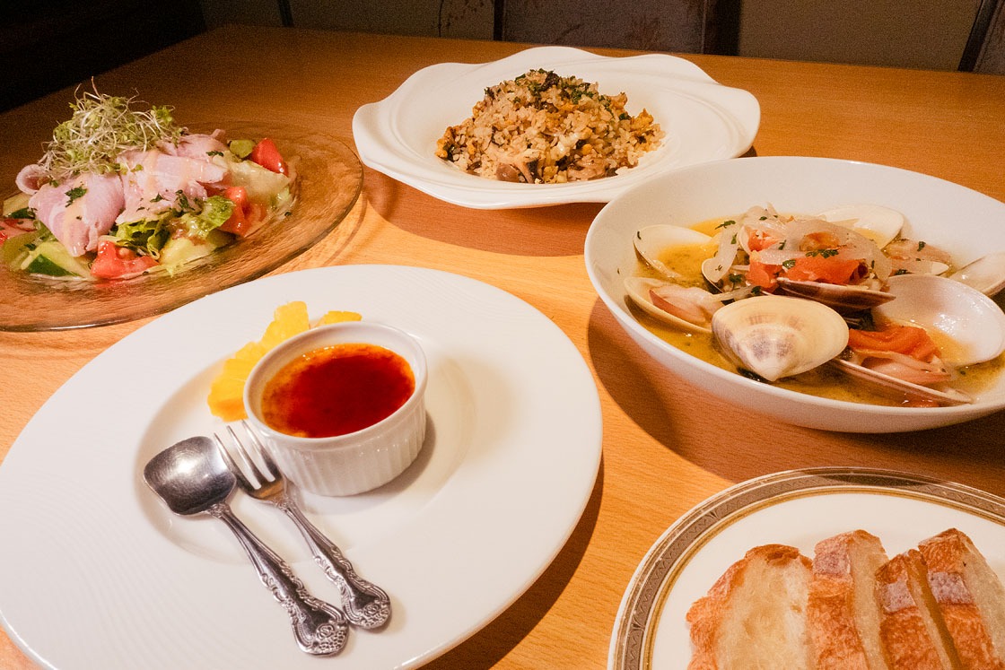 Now I'll admit, this is quite a lot of food for one person, but I wanted to show you as much as possible. I got the Roast Ham Salad, "Hamaguri Wine Mushi", "Shigure Pilaf", and a Kabocha Pudding. The salad was made with their own home-roasted ham, while the two seafood dishes are local specialties. "Hamaguri Wine Mushi" is wine-steamed Hamaguri clams, which Kuwana is known for. Shigure Pilaf, on the other hand, is a rice dish made with a preserved version of those clams called shigure, made by simmering in a sweet and salty sauce. That same sauce is then used to add a salty umami note to the Kabocha Pudding!